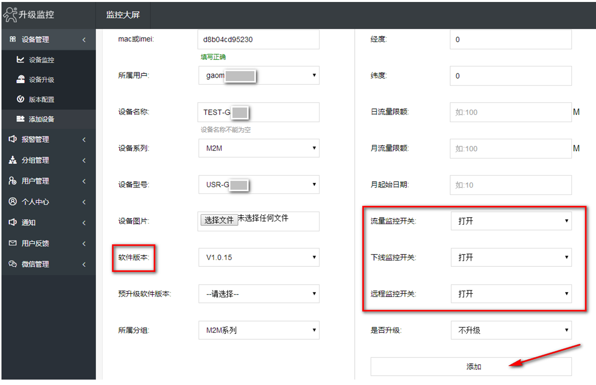 4、點擊“版本配置”,系列選擇M2M,型號按照實際情況填寫,軟件版本選擇添加--輸入自己設(shè)備目前的版本號