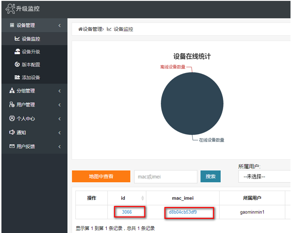 6、等待1分鐘左右,點擊“設(shè)備監(jiān)控”,在設(shè)備監(jiān)控界面,即可看到在線設(shè)備,如下