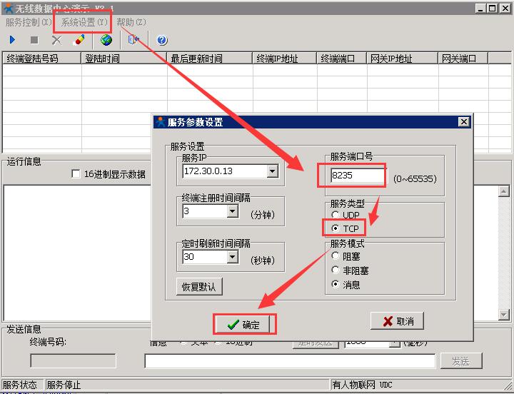 系統(tǒng)設(shè)置-->設(shè)置服務(wù)IP和端口號(hào)-->選擇服務(wù)類型-->服務(wù)模式默認(rèn)-->確定