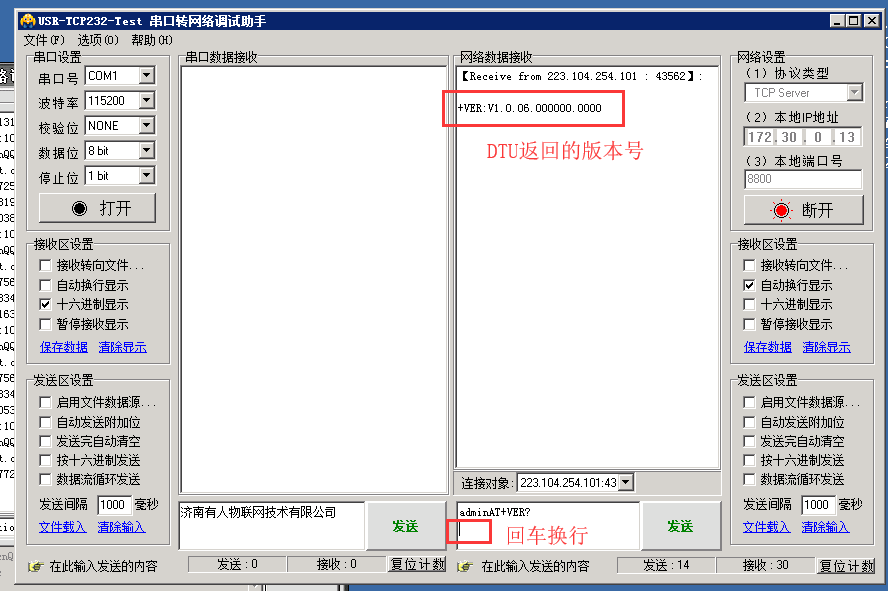 2. 連接成功后,可以從服務(wù)器端發(fā)送網(wǎng)絡(luò)AT指令來查詢/設(shè)置DTU的參數(shù)