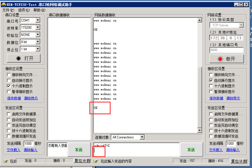 注意:修改的參數(shù)都需要重啟后才能生效,所以最后發(fā)送adminAT+Z重啟DTU