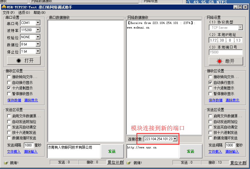 設(shè)置SOCKA的參數(shù):adminAT+SOCKA=”TCP”,”94.191.7.252”,15000