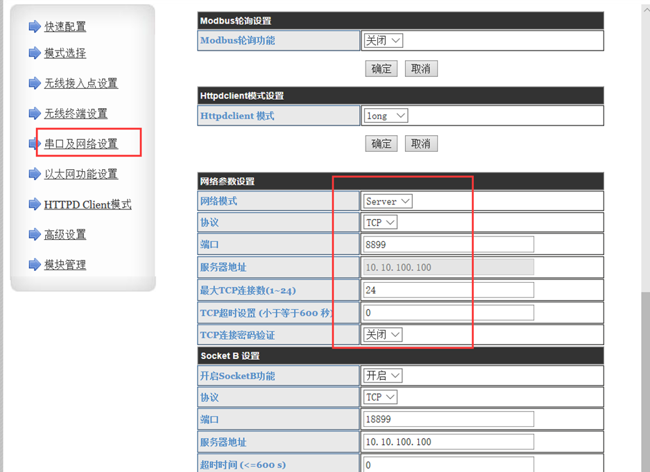 (1)第一種結(jié)果測(cè)試方法:打開(kāi)有人串口轉(zhuǎn)網(wǎng)絡(luò)調(diào)試助手,參數(shù)配置如圖