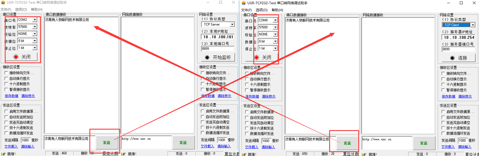 打開(kāi)兩個(gè)串口調(diào)試助手測(cè)試,結(jié)果如圖: