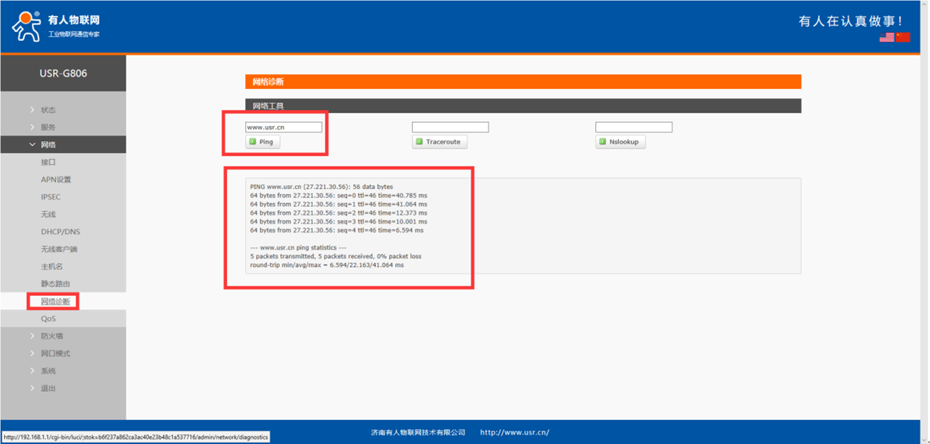 3、 打開(kāi)瀏覽器,地址欄輸入192.168.1.1,進(jìn)入G806的設(shè)置網(wǎng)頁(yè),用戶名密碼都是root(注意:不要使用360瀏覽器),點(diǎn)擊網(wǎng)絡(luò)---接口界面,可以看到當(dāng)前有三個(gè)接口,LAN、WAN-4G、WAN-WIRED,分別是局域網(wǎng)接口,4G接口,有線網(wǎng)接口。(注意:LAN接口網(wǎng)段和其他的WAN接口IP網(wǎng)段不能沖突。)