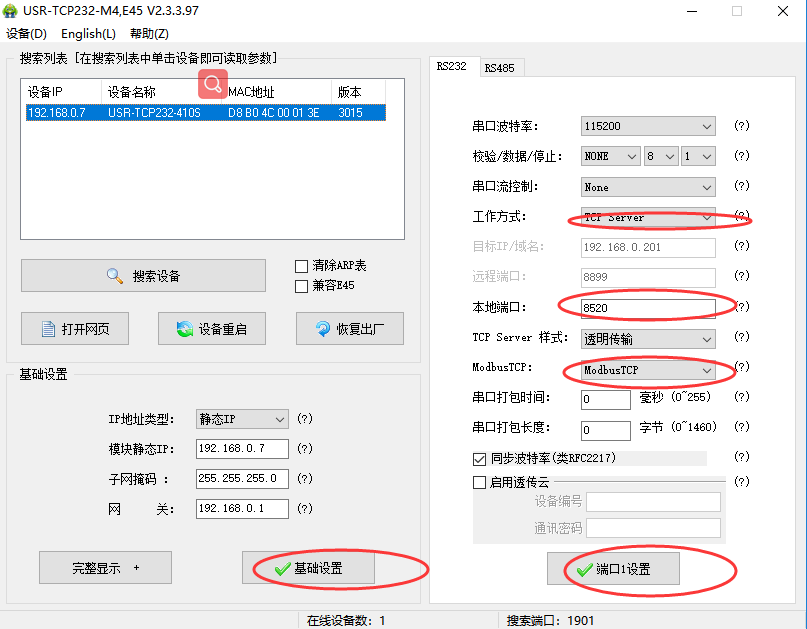 2. 打開設(shè)置軟件:USR-TCP232-M4-setup-V2.3.3.97,然后工作方式選擇“TCP SEVER”然后將本地端口號(hào)設(shè)置為“8520”,將modbus 改為“modbus tcp”然后端口1設(shè)置確定下,然后設(shè)備重啟下。