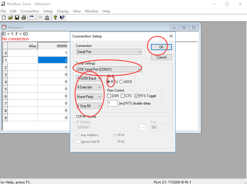 3. 打開Modbus Slave,設(shè)置參數(shù)如圖所示