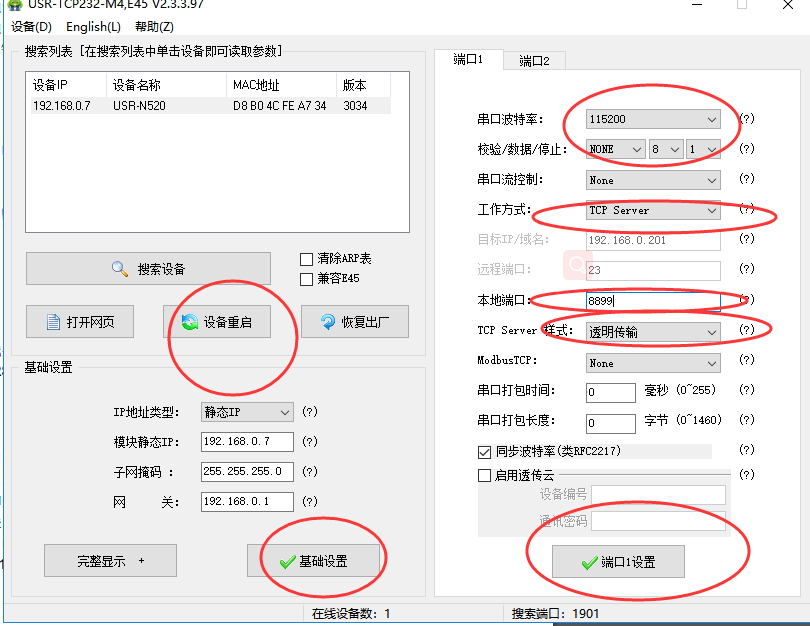 1. 設置N520 (第一臺)的參數(shù):打開設置軟件USR-TCP232-M4-setup-V2.3.3.97,設置他的工作方式為TCP sever,設置本地端口號為8899. 然后點擊“端口1設置”,再點擊“設備重啟”。如圖所示: