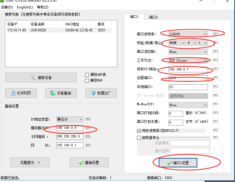 2. 設置N520 (第二臺)的參數(shù):打開設置軟件USR-TCP232-M4-setup-V2.3.3.97,設置他的工作方式為TCP clinet,設置他的“目標IP/域名”為:192.168.0.7,設置遠程端口號為8899,然后點擊“端口1設置”,點擊“基礎設置”再點擊“設備重啟”。如圖所示: