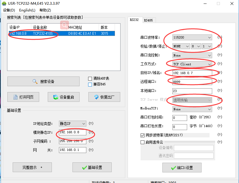 2. 設(shè)置410S (第二臺)的參數(shù):打開設(shè)置軟件USR-TCP232-M4-setup-V2.3.3.97,設(shè)置他的工作方式為TCP clinet,設(shè)置他的“目標(biāo)IP/域名”為:192.168.0.7,設(shè)置遠(yuǎn)程端口號為8899,然后點擊“端口1設(shè)置”,點擊“基礎(chǔ)設(shè)置”再點擊“設(shè)備重啟”。如圖所示: