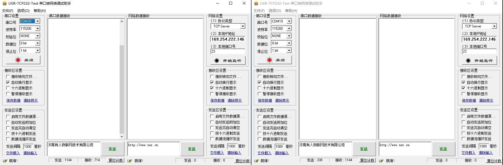 3. 將兩太設(shè)備通過網(wǎng)線鏈接,分別用USB轉(zhuǎn)232串口線將他們鏈接到電腦上,打開兩個測試軟件(USR-TCP232-Test-V1.3),分別打開兩者對應(yīng)的串口: