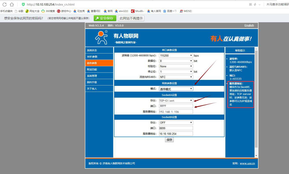 在這個選項(xiàng)中,可以設(shè)置W600的串口參數(shù)以及網(wǎng)絡(luò)參數(shù),客戶可以根據(jù)實(shí)際情況確認(rèn)是否需要修改波特率以及W600的網(wǎng)絡(luò)工作模式,W600做TCP Client,連接副武器的ip和端口(此時,電腦做服務(wù)器,就需要設(shè)備連接電腦的ip和端口)