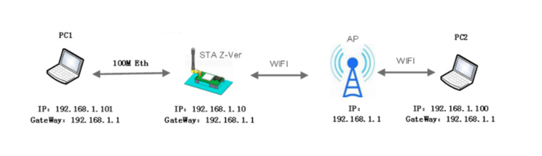 USR-W610模塊(以下簡稱W610)通過Wi-Fi接到AP上,PC1通過以太網(wǎng)接到W610模塊上,這時W610模塊相當于一個透明的設(shè)備,PC1和PC2在同一個局域網(wǎng),相互通訊不受任何限制,如果AP可以聯(lián)網(wǎng),那么PC1也是可以上網(wǎng)的。下面介紹如何設(shè)置A2模塊,才能實現(xiàn)這種功能。