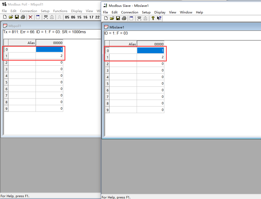 (8)數(shù)據(jù)通信。在Modbus slave軟件中修改對(duì)應(yīng)寄存器的值,在Modbus poll軟件中會(huì)對(duì)應(yīng)自動(dòng)讀取到改變后的值。