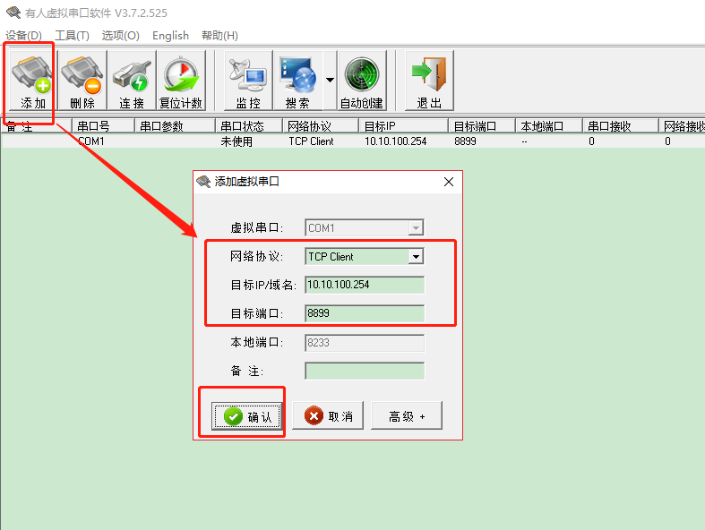 添加虛擬串口com1:連接模塊的IP和端口:10.10.100.254:8899