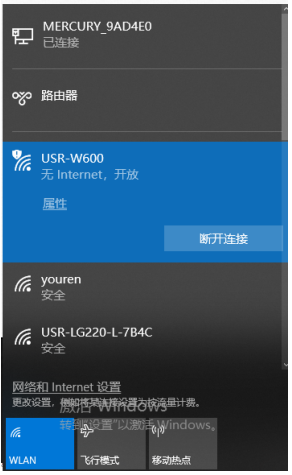 a. 給模塊上電,待模塊READY燈亮后,電腦無(wú)線網(wǎng)絡(luò)加入(w600).打開(kāi)網(wǎng)頁(yè),登錄10.10.100.254.賬號(hào)和密碼都是admin;