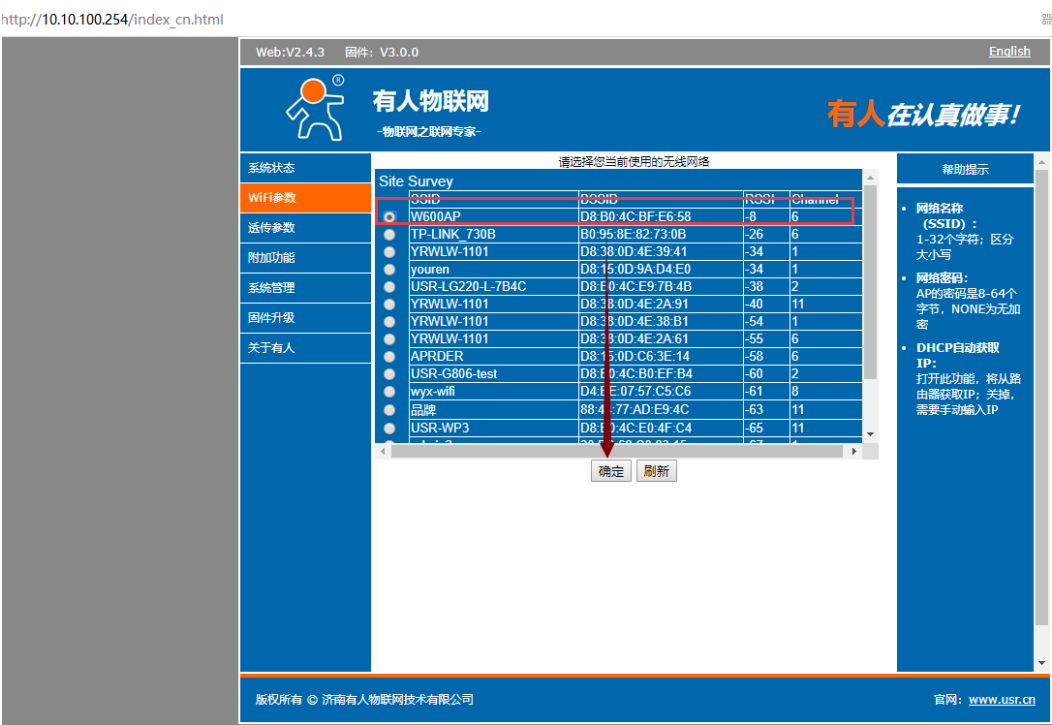 選擇搜索到的AP模塊信號(hào)(W600AP)。點(diǎn)擊確定(不要馬上重啟模塊,所有設(shè)置完成后再重啟)