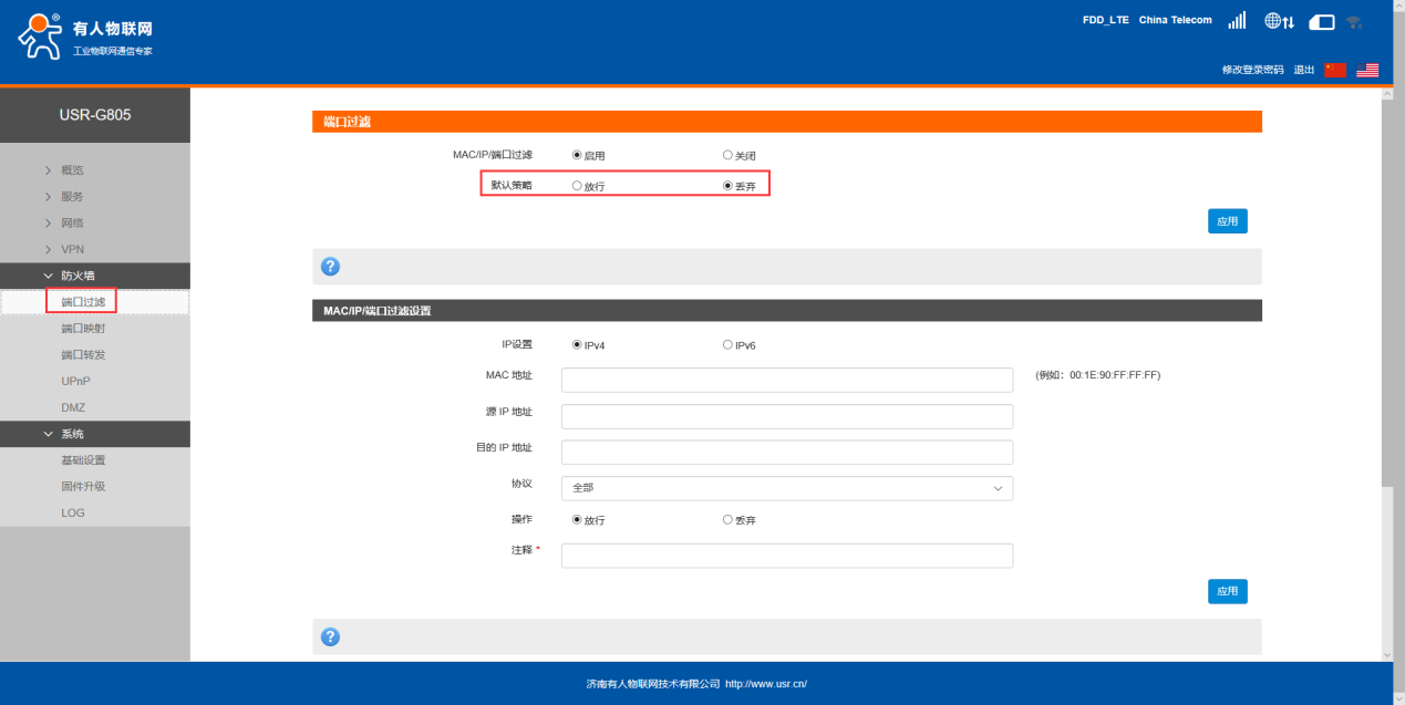 2、防火墻---端口過(guò)濾,MAC/IP/端口過(guò)濾選擇“啟用”,默認(rèn)策略選擇“丟棄”。點(diǎn)擊“應(yīng)用”。