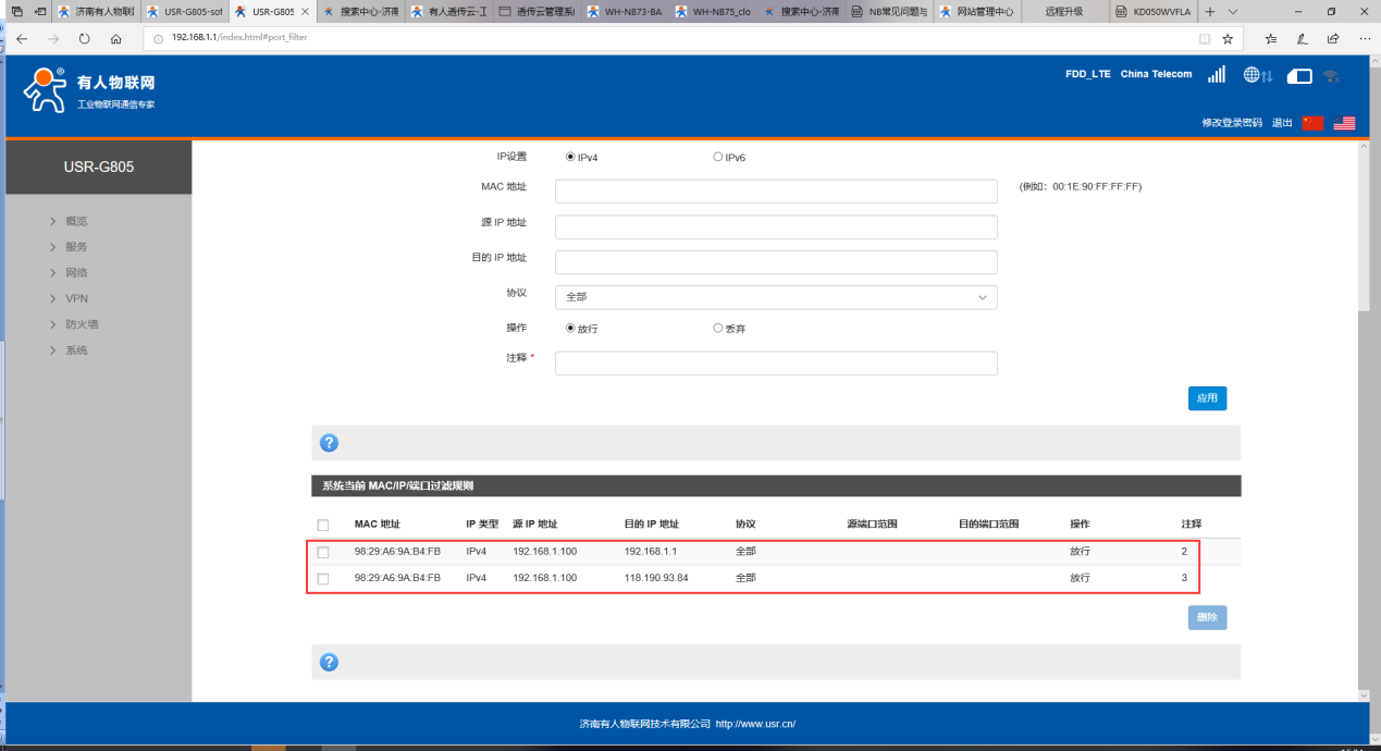 填寫PC的MAC、IP,目的IP填寫G805的LAN口IP,協(xié)議選擇全部,操作選擇“放行”。設(shè)置完成后點(diǎn)擊應(yīng)用。