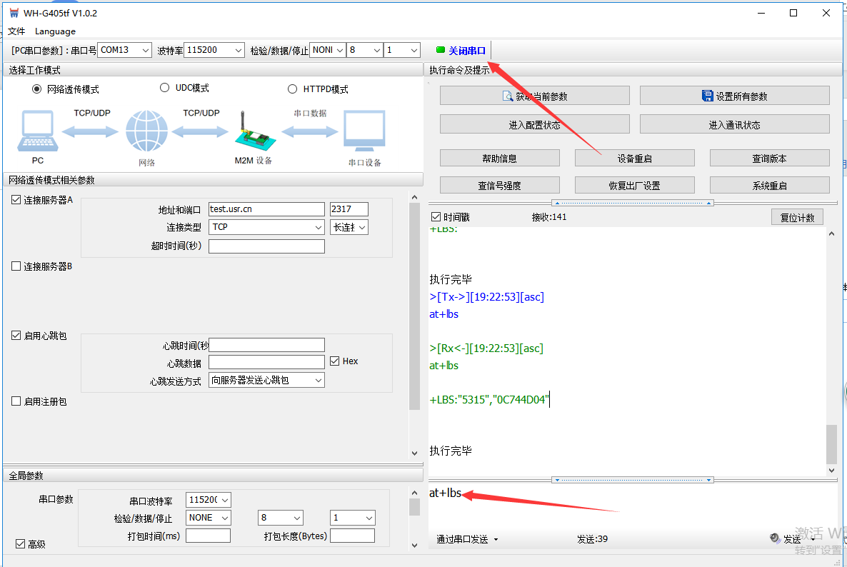 1.7S4放入sim卡,上電,串口連接電腦,打開配置軟件,帶7s4上電穩(wěn)定后,點(diǎn)擊打開串口,從發(fā)送框鍵入AT+LBS(回車換行),等待返回的數(shù)據(jù),如圖1.