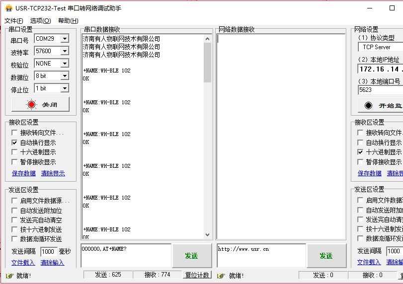 正確打開串口后,點擊“+++a”,接收區(qū)顯示“a+ok”說明模塊進(jìn)入了命令行模式。