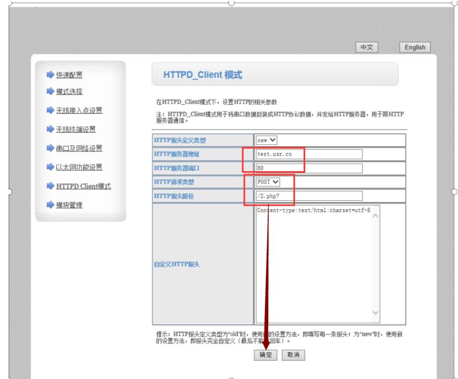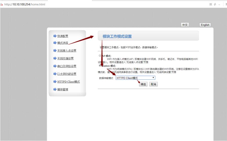 2、在模式選擇設(shè)置為STA模式,數(shù)據(jù)傳輸格式為Httpd client ,設(shè)置完點擊確定;