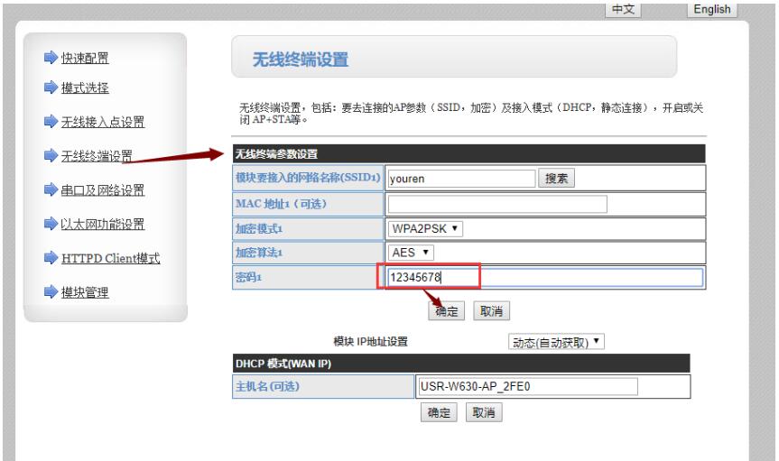 3、搜索WiFi模塊要連接的路由器ssid,設(shè)置上密碼,點擊確定;