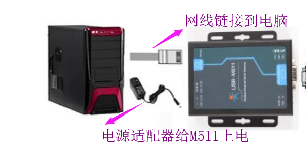 將M511的網(wǎng)口通過網(wǎng)線鏈接到電腦的網(wǎng)口,通過電源適配器為M511上電。