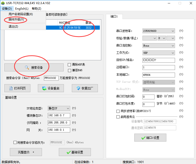 2. 打開設(shè)置軟件:USR-M4_V2.3.4.102,點擊“搜索設(shè)備”,搜索到設(shè)備后,雙擊選中 搜索到的設(shè)備,點擊“設(shè)備”,選擇“固件升級”。如圖: