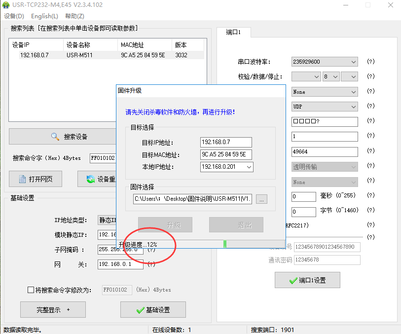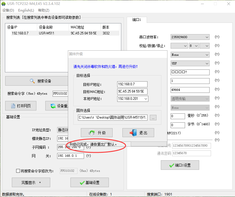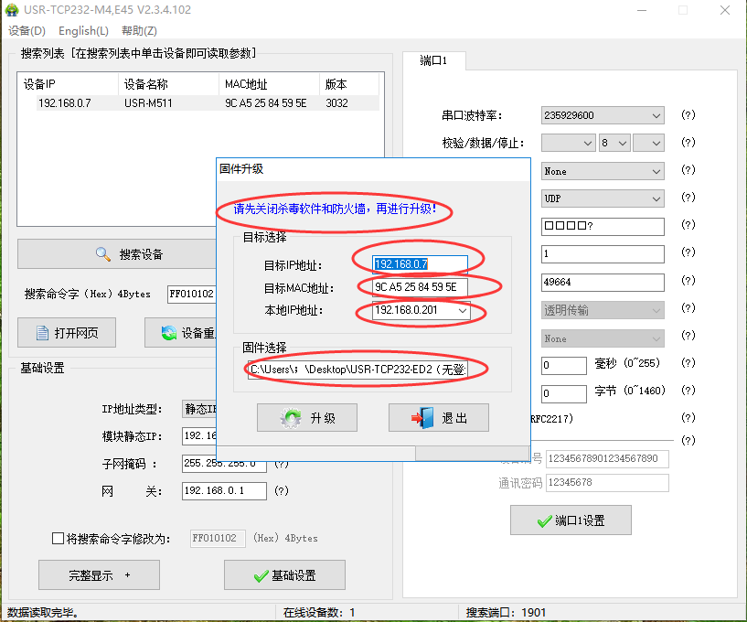 1. USR-M511、 2.網(wǎng)線、 3.標準電源適配器、 4.所要升級的固件(可向技術(shù)支持索要)、 5.升級軟件:USR-M4_V2.3.4.102(版本可能有更新,最新版即可)