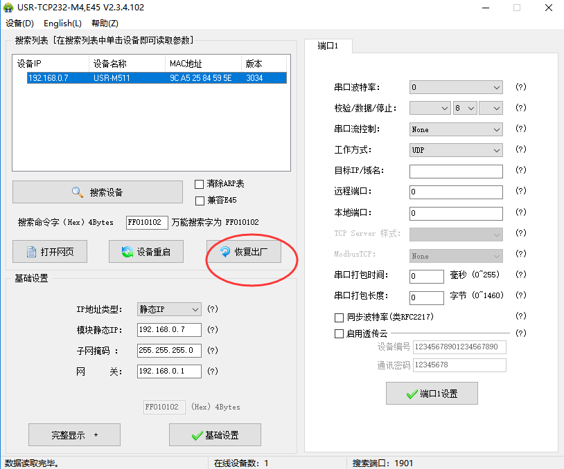 在搜索界面重新搜索設(shè)備,選中設(shè)備,選擇恢復出廠設(shè)置。