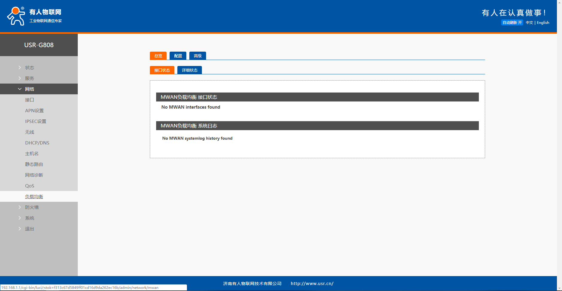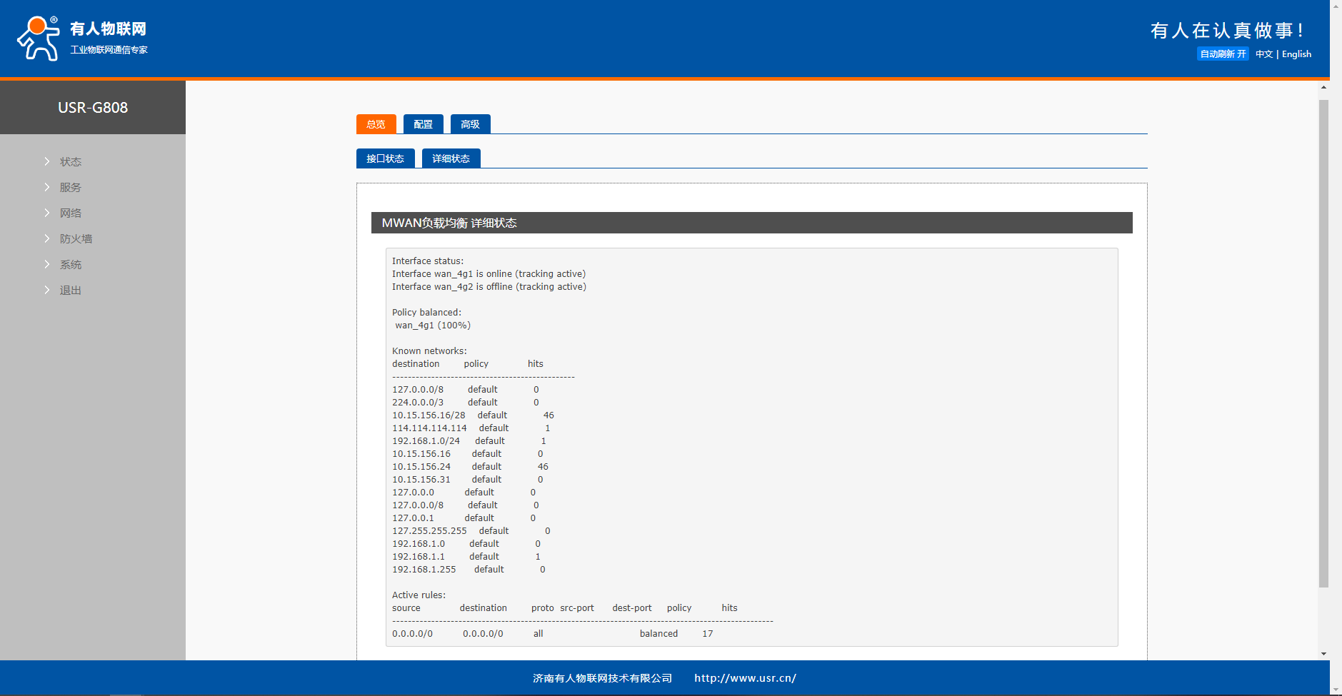 待設(shè)備重啟完畢后,可以在總覽里點擊接口狀態(tài),發(fā)現(xiàn)兩個接口變成綠色表示配置成功,紅色表示沒有成功。在詳細(xì)狀態(tài)里面可以看到兩個接口的進(jìn)行的負(fù)載占比。