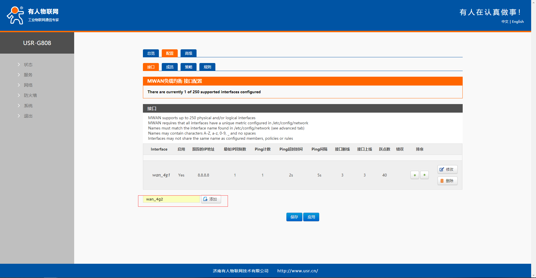 點擊配置----接口,創(chuàng)建接口兩個(接口名稱可以自定義),這里是 wan_4g1 和 wan_4g2 后,點擊添加。注意:這個接口的名字必須和上面的接口處的名字一樣。