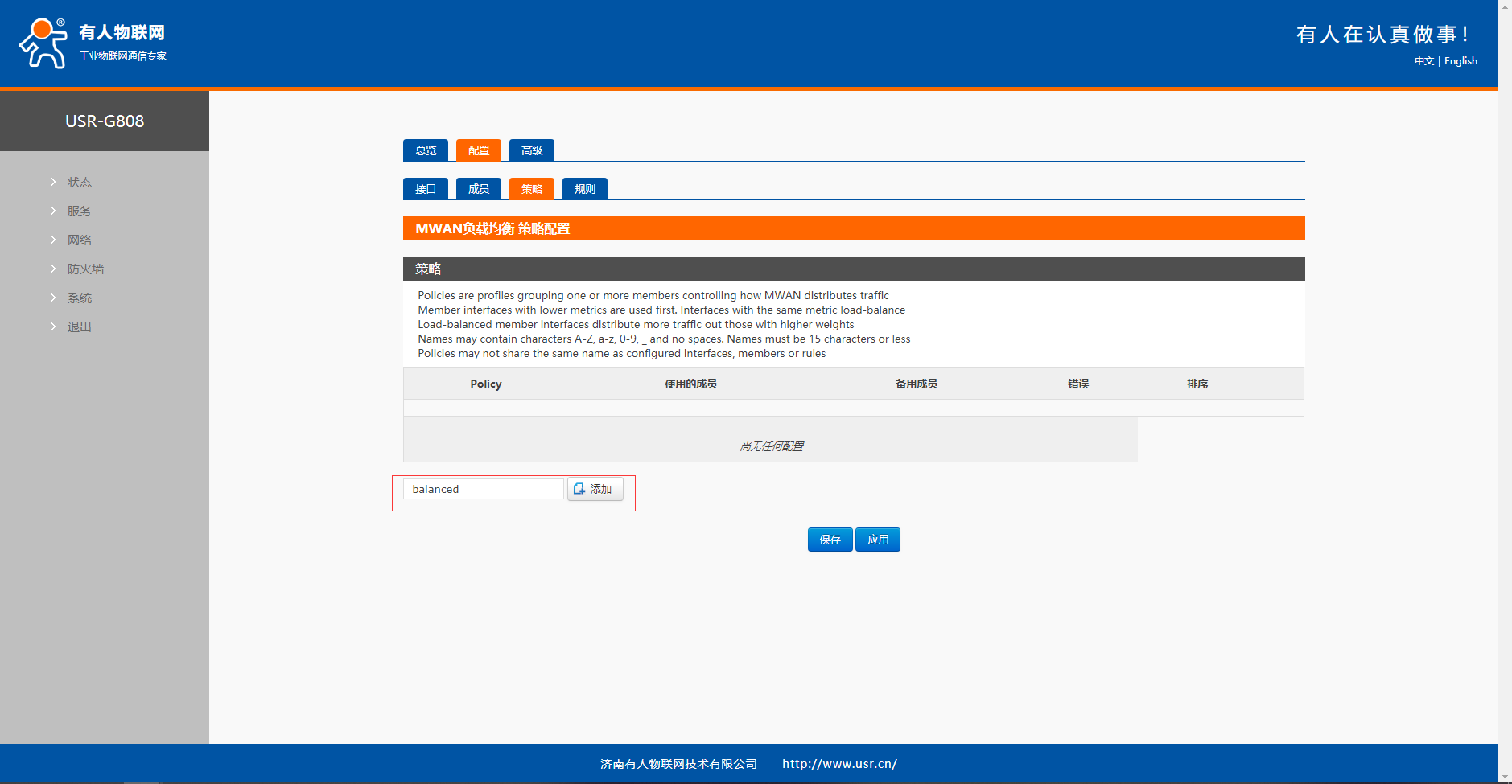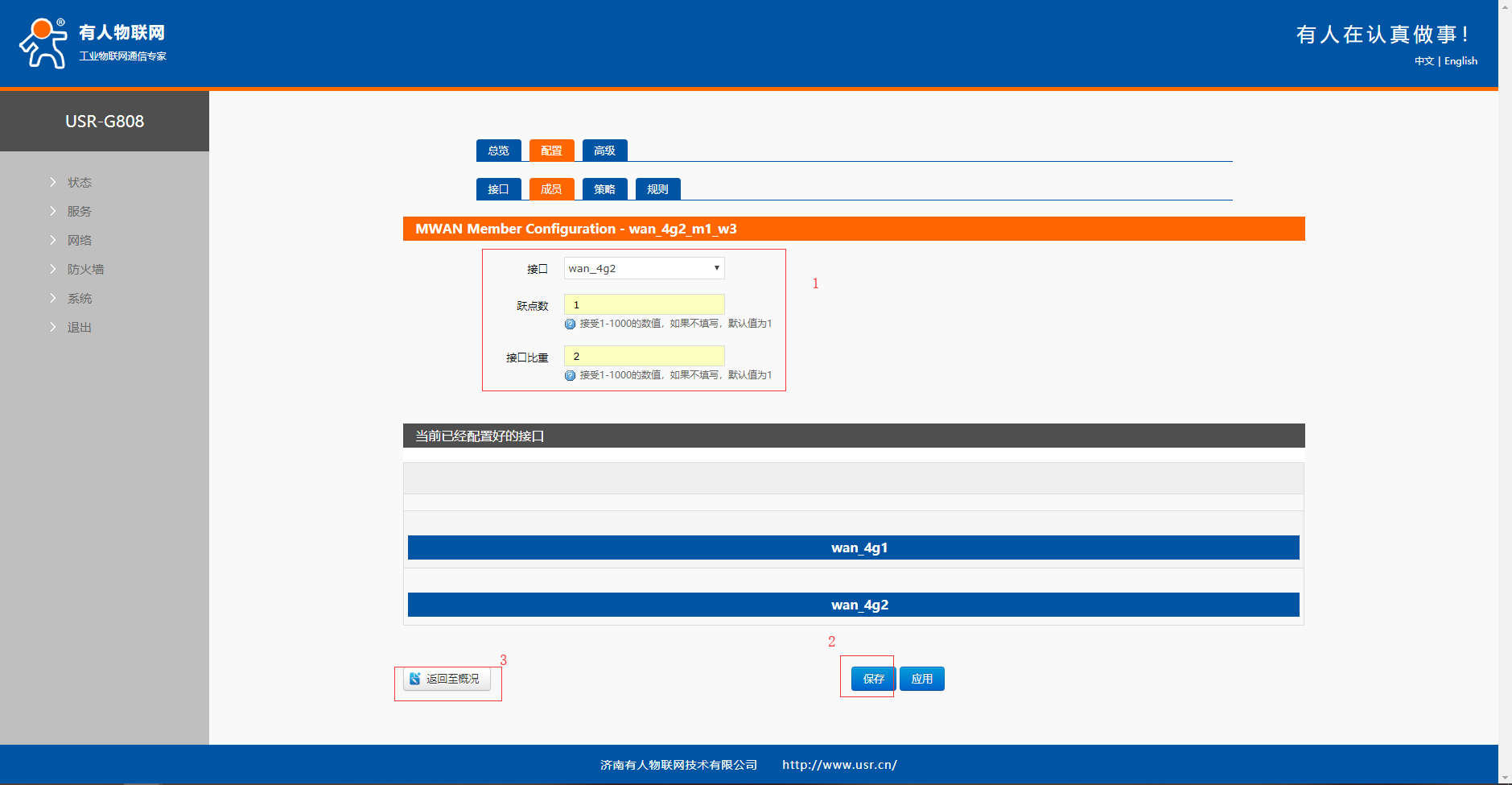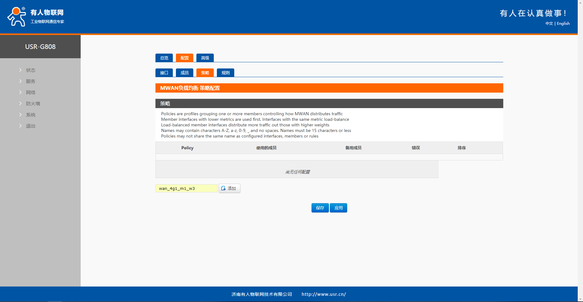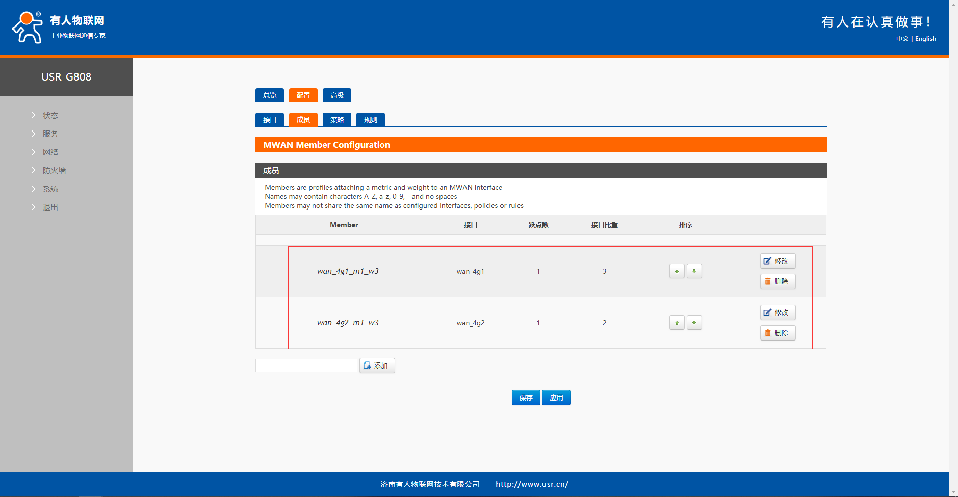 點擊配置----成員進(jìn)入成員配置界面。添加成員(成員名稱可以自定義),這里是 wan_4g1_m1_w3 和 wan_4g2_m1_w3 后,點擊添加