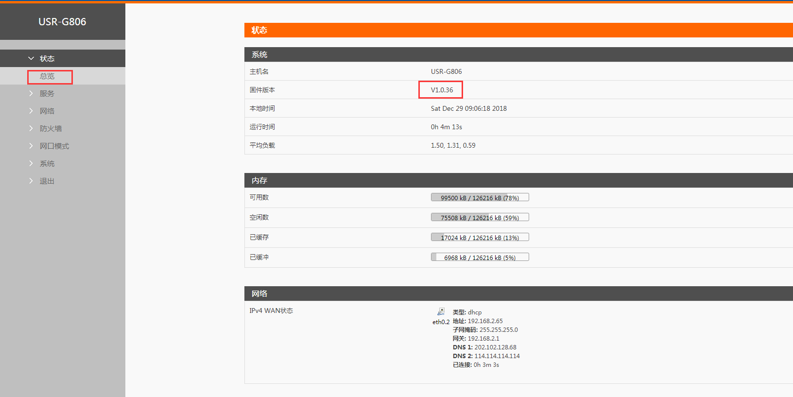 2、 在狀態(tài)-->總覽里邊可以看到固件版本號(hào)V1.0.36,現(xiàn)在升級(jí)到V1.0.38版本。