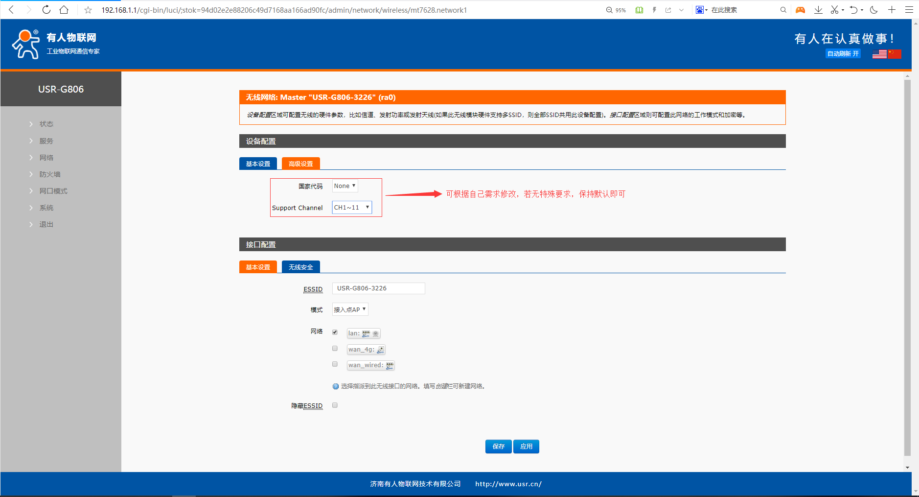 1、 將工業(yè)路由器G806上電后進(jìn)入設(shè)置界面,在左側(cè)的“網(wǎng)絡(luò)”——“無線”命令下,點(diǎn)擊對(duì)應(yīng)的修改按鈕,進(jìn)入WiFi的參數(shù)修改界面