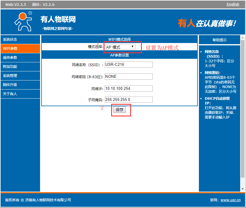 1、進(jìn)入內(nèi)置網(wǎng)頁,216出廠默認(rèn)AP模式,默認(rèn)參數(shù):115200,N,8,1