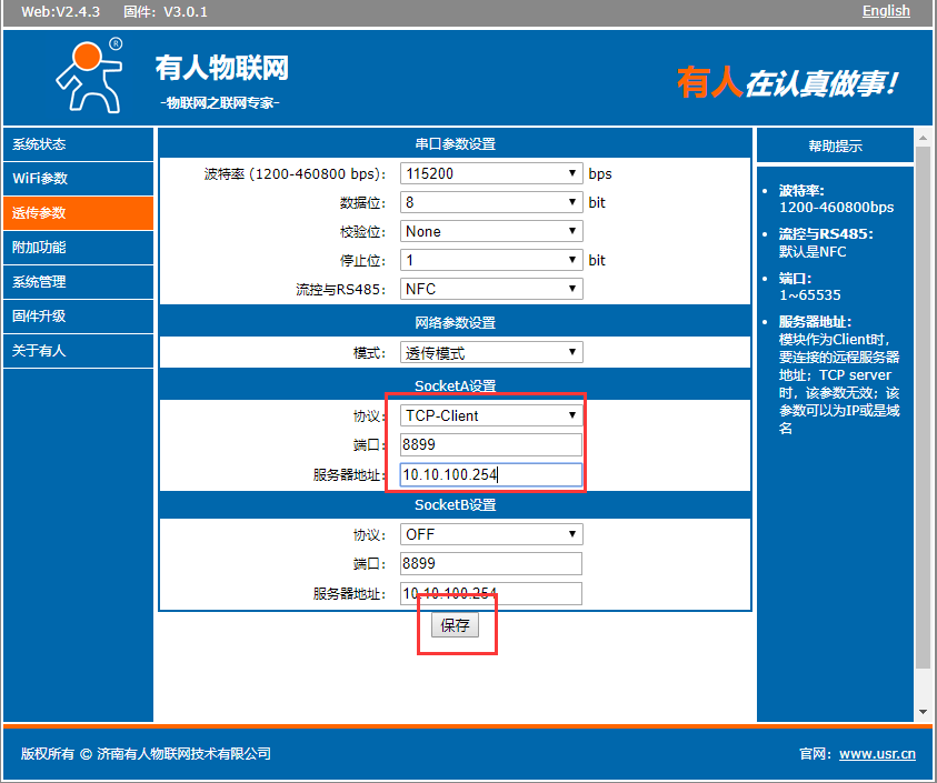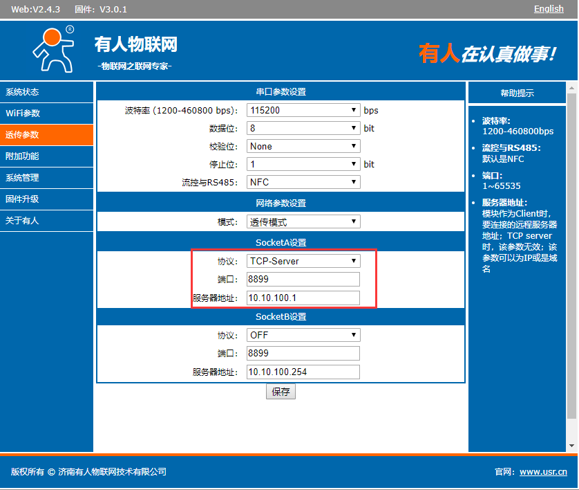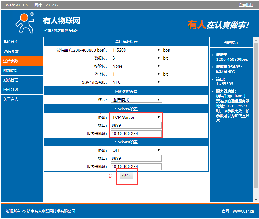 選擇協(xié)議:TCP-Server 端口號(hào):8899 IP地址:10.10.100.1 設(shè)置完成后保存,重啟