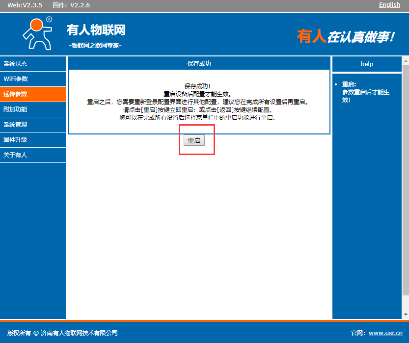 設(shè)為STA模式的216做client,端口號(hào)要和為AP模式所設(shè)置的端口號(hào)一樣,ip地址為AP模式所設(shè)IP地址,設(shè)置完成后,點(diǎn)擊保存,點(diǎn)擊重啟,所配置的參數(shù)均在重啟后生效