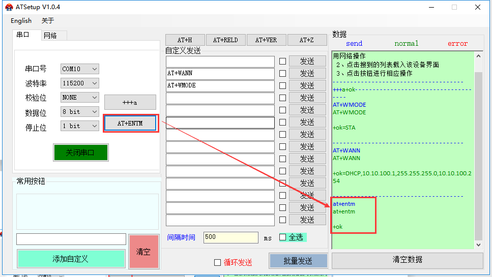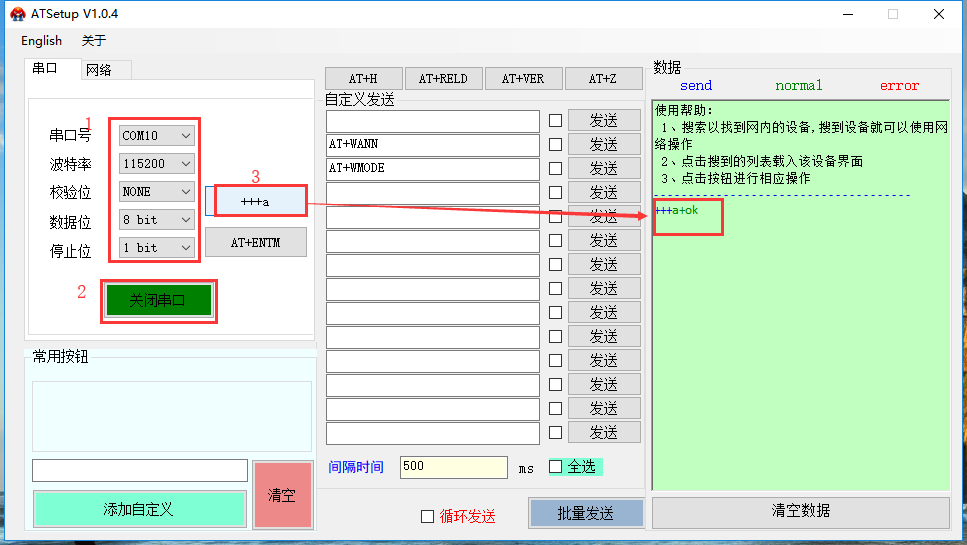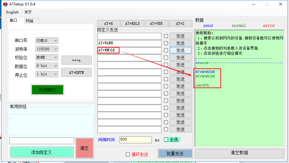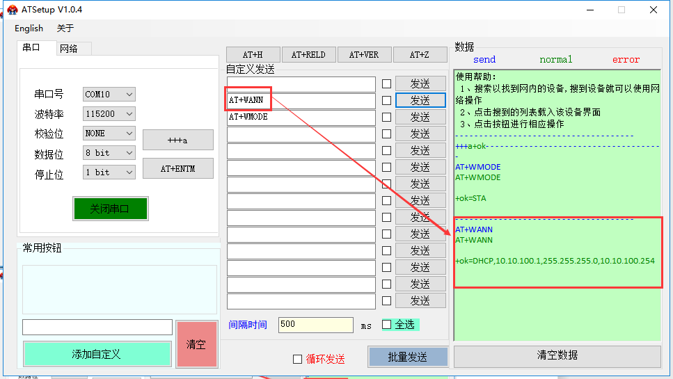2、打開AT指令軟件,選擇相應(yīng)的串口號(hào),以及串口參數(shù)(默認(rèn):115200,N,8,1),打開串口,點(diǎn)擊“+++a”進(jìn)入配置狀態(tài),用AT指令:AT+WMODE查詢模塊所處工作模式,用AT+WANN查詢模塊的IP地址,退出配置狀態(tài),關(guān)閉串口。(其他AT指令您可以參考軟件設(shè)計(jì)手冊(cè)41頁)
