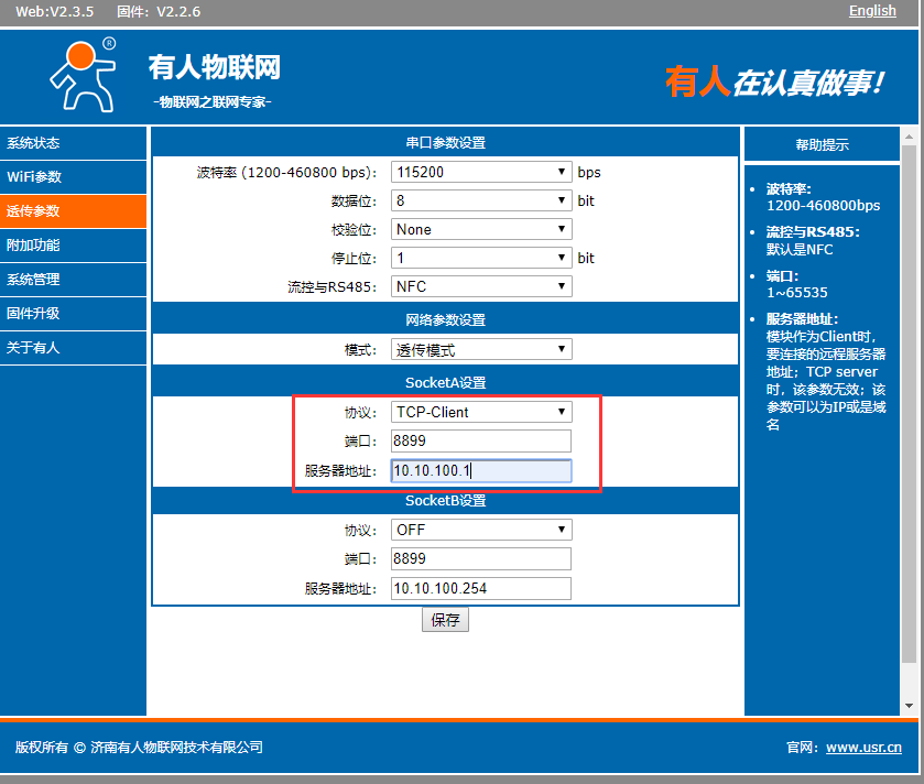 4、設(shè)為AP模式的216做server,此處以8899為例(端口號(hào)可設(shè)),ip地址為10.10.100.1,設(shè)置完成后,點(diǎn)擊保存,點(diǎn)擊重啟,所配置的參數(shù)均在重啟后生效