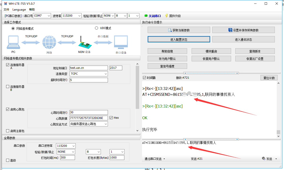 1.4g模塊7s5上電,串口與電腦連接,放入sim卡,(注:物聯(lián)卡不能發(fā)短信),點(diǎn)擊打開(kāi)串口,點(diǎn)擊進(jìn)入配置狀態(tài),返回ok表示進(jìn)入配置狀態(tài),發(fā)送如下指令:AT+CISMSSEND=8613854123456,1,聯(lián)網(wǎng)的事情找有人,按回車(chē),然后點(diǎn)擊發(fā)送按鈕,此時(shí)可以在接收端看到這條短信如圖1(2)。