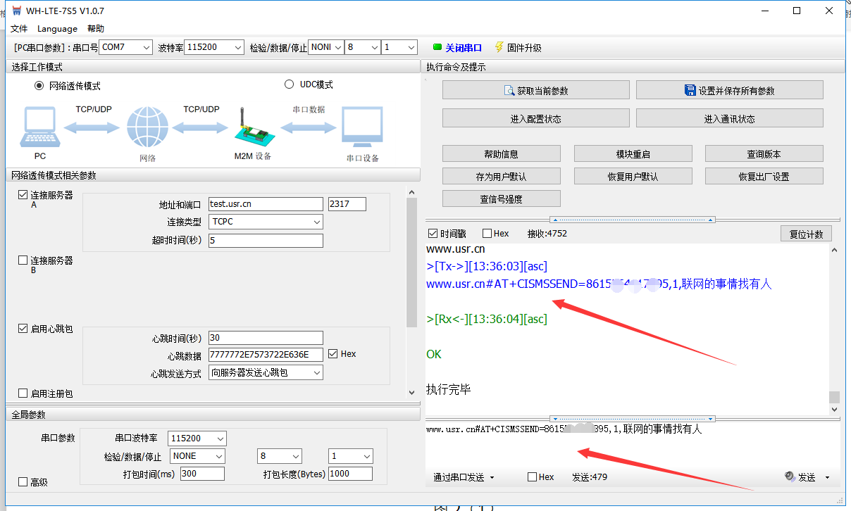 2.或者直接使用串口AT指令發(fā)送格式(命令密碼加at指令,可在正常通信狀態(tài)下發(fā)送短信)如下圖: