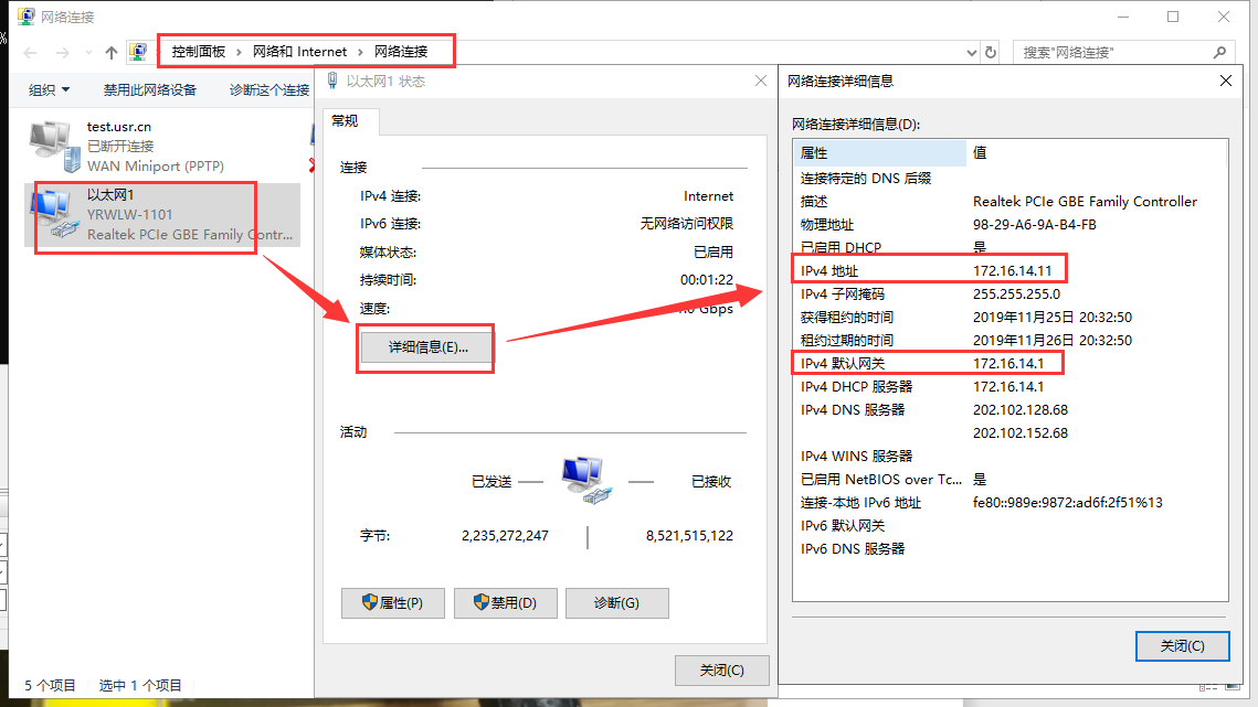 1、有線網(wǎng)線連接PC,在控制面板中打開網(wǎng)卡的詳細信息,查看一下獲取的IP是哪個網(wǎng)段的,G781的LAN口IP出廠默認192.168.1.1,如果該有線網(wǎng)的網(wǎng)段和G781的LAN口網(wǎng)段在同一網(wǎng)段,需要先修改一下G781的LAN口網(wǎng)段或者先修改一下該網(wǎng)線的IP網(wǎng)段,排除IP沖突。