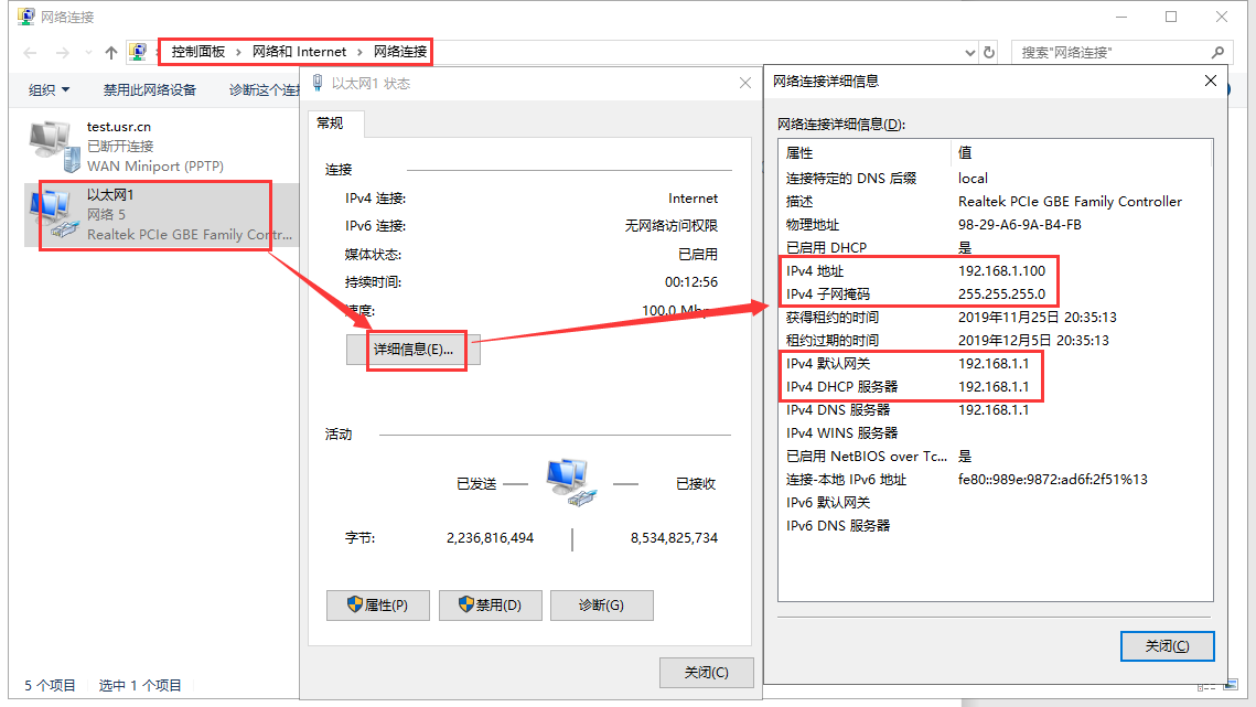 1、在控制面板中打開網(wǎng)卡的詳細信息,查看PC是否正確獲取到IP,如下獲取到的IP與G781LAN口在同一網(wǎng)段,且網(wǎng)關(guān)一致。