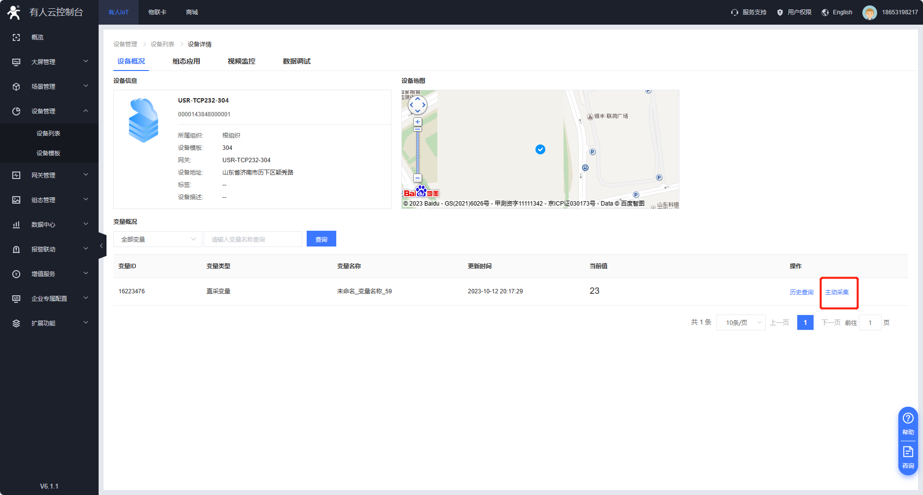 3、在有人云平臺上找到對應的設備,點擊數(shù)據(jù)查看-主動采集??梢栽谟腥嗽破脚_查看設備傳輸?shù)拇跀?shù)據(jù)。