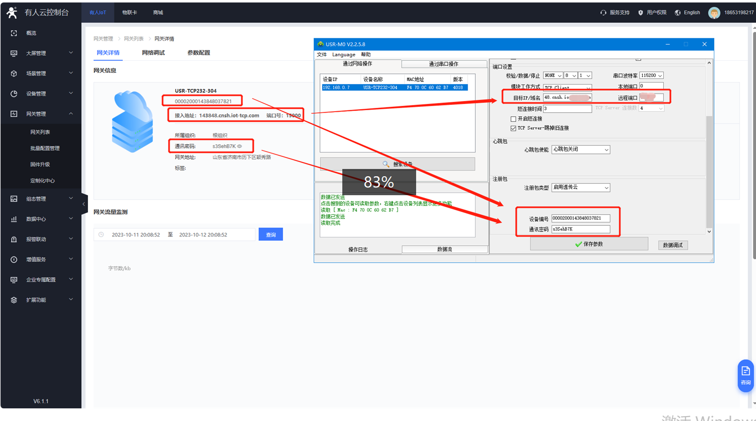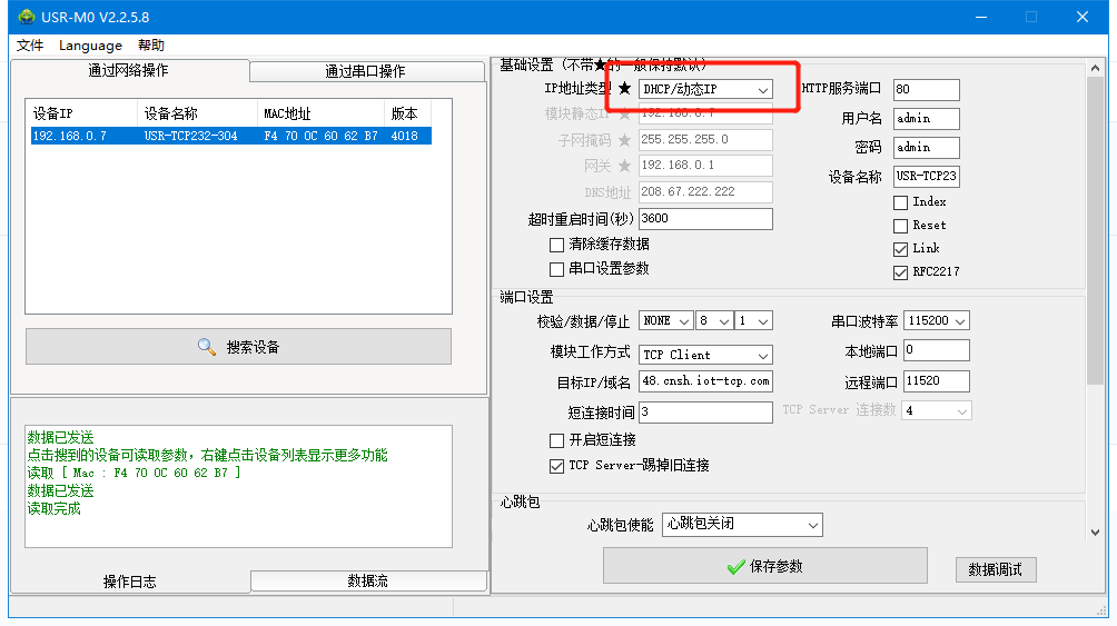 4、IP地址類型更改為DHCP/動態(tài)IP,設置完成后通過網(wǎng)線將304的網(wǎng)口接到路由器LAN口上面,給設備供網(wǎng)。工作方式選擇TCP Client,目標IP:自己的云平臺接入地址,遠程端口號:15000,設置完成后點擊保存參數(shù)。