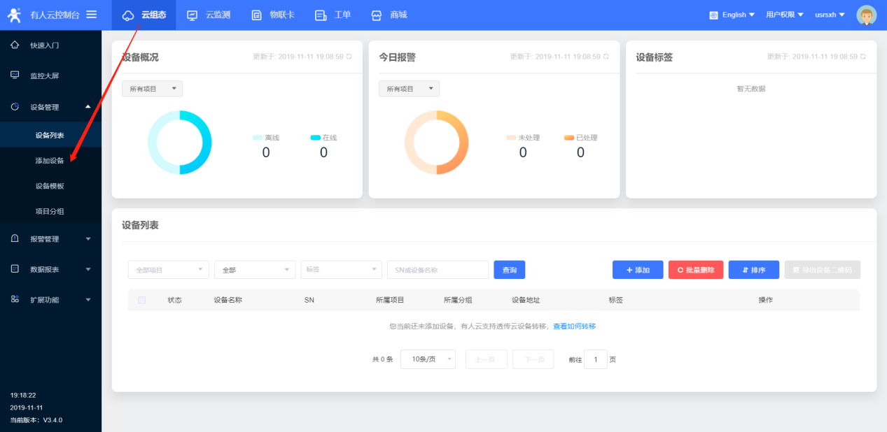 5、本次案例是A2/B2連有人云進行數(shù)據(jù)顯示,可以進入云組態(tài),選擇添加設(shè)備;
