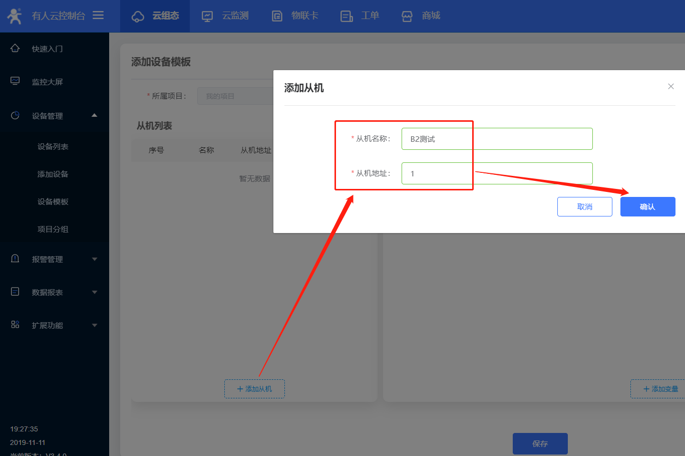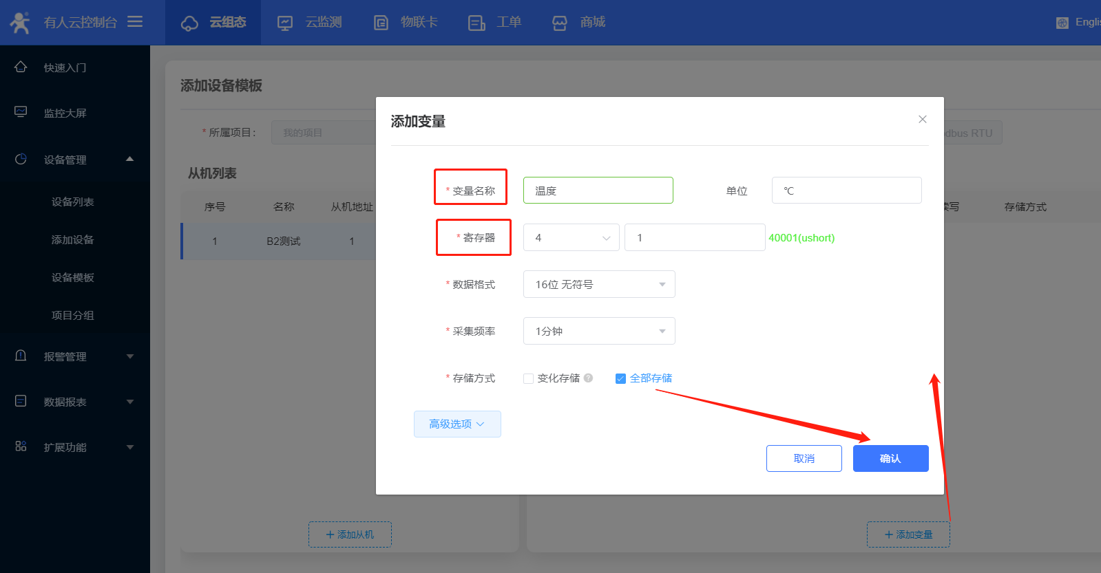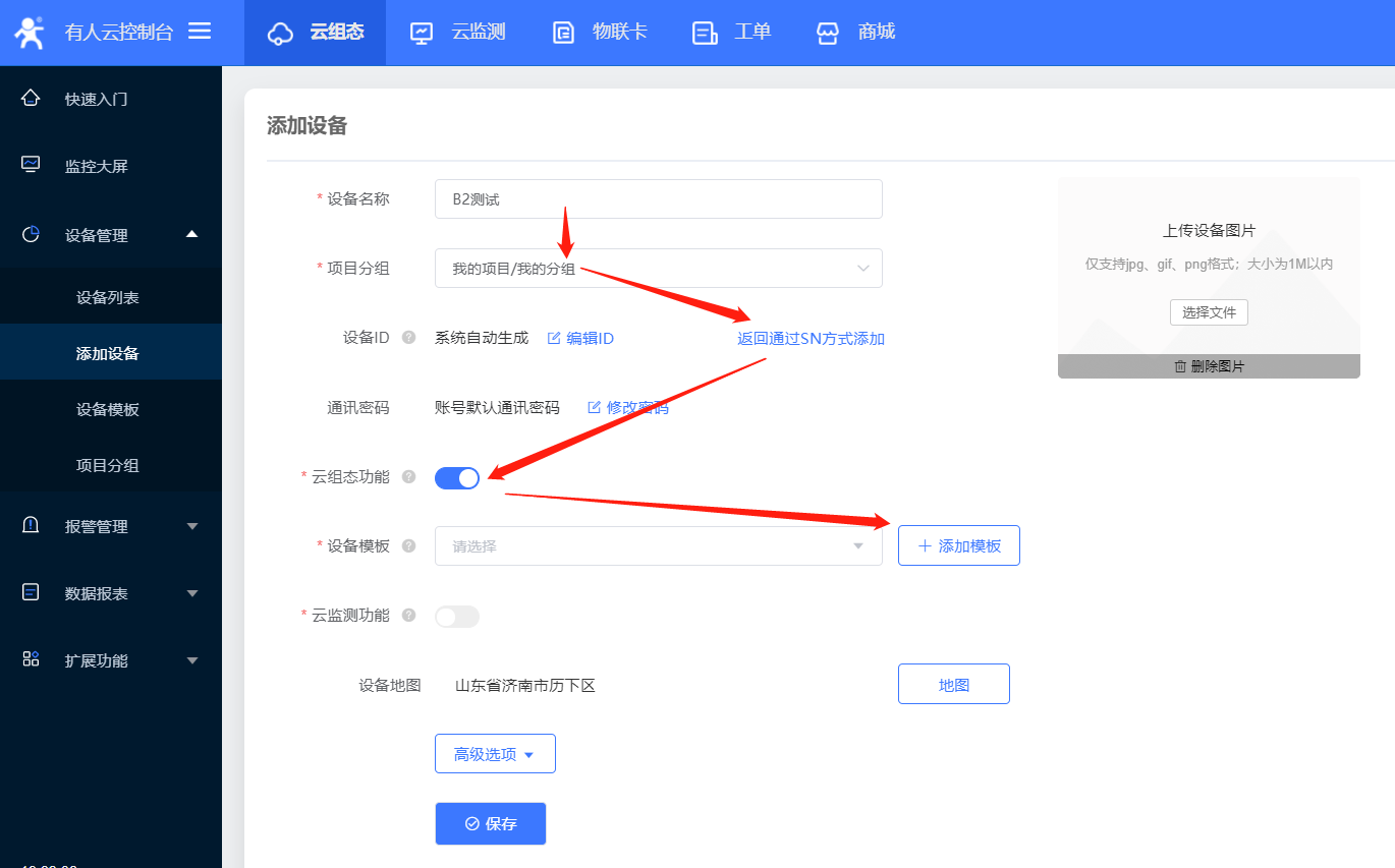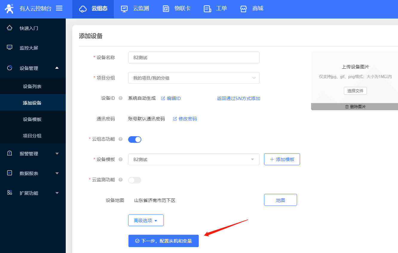 6、設(shè)置設(shè)備名稱,和項目分組,A2/B2目前只能使用ID方式添加設(shè)備id;設(shè)備id和密碼設(shè)置默認就可以,選擇云組態(tài),添加數(shù)據(jù)模板;