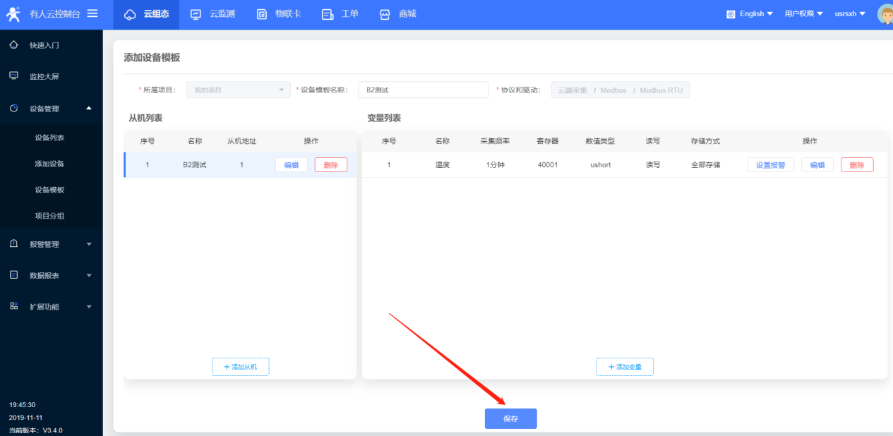 7、模板更改名稱,選擇modbus rtu協(xié)議,點擊保存